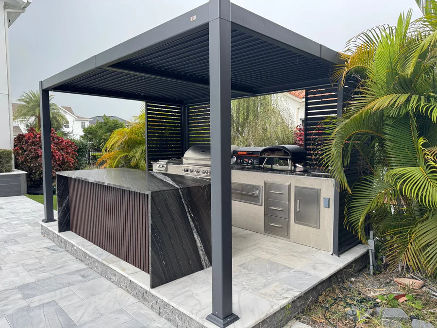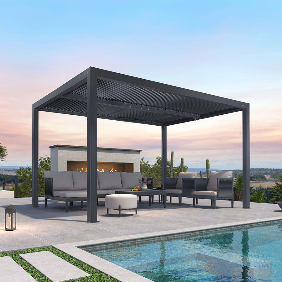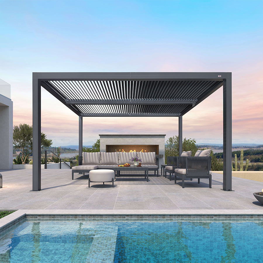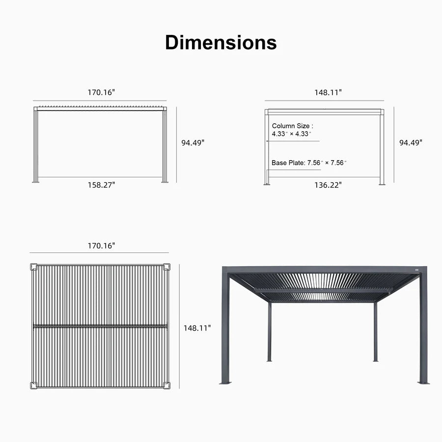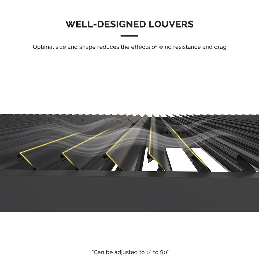 Independent Adjustable Aluminum Louvered Roof: Designed with independent adjustable roofs, equipped with adjustable poles that allow you to adjust it effortlessly from 0° to 90°, offering multiple protection options against sun, rain, and wind.